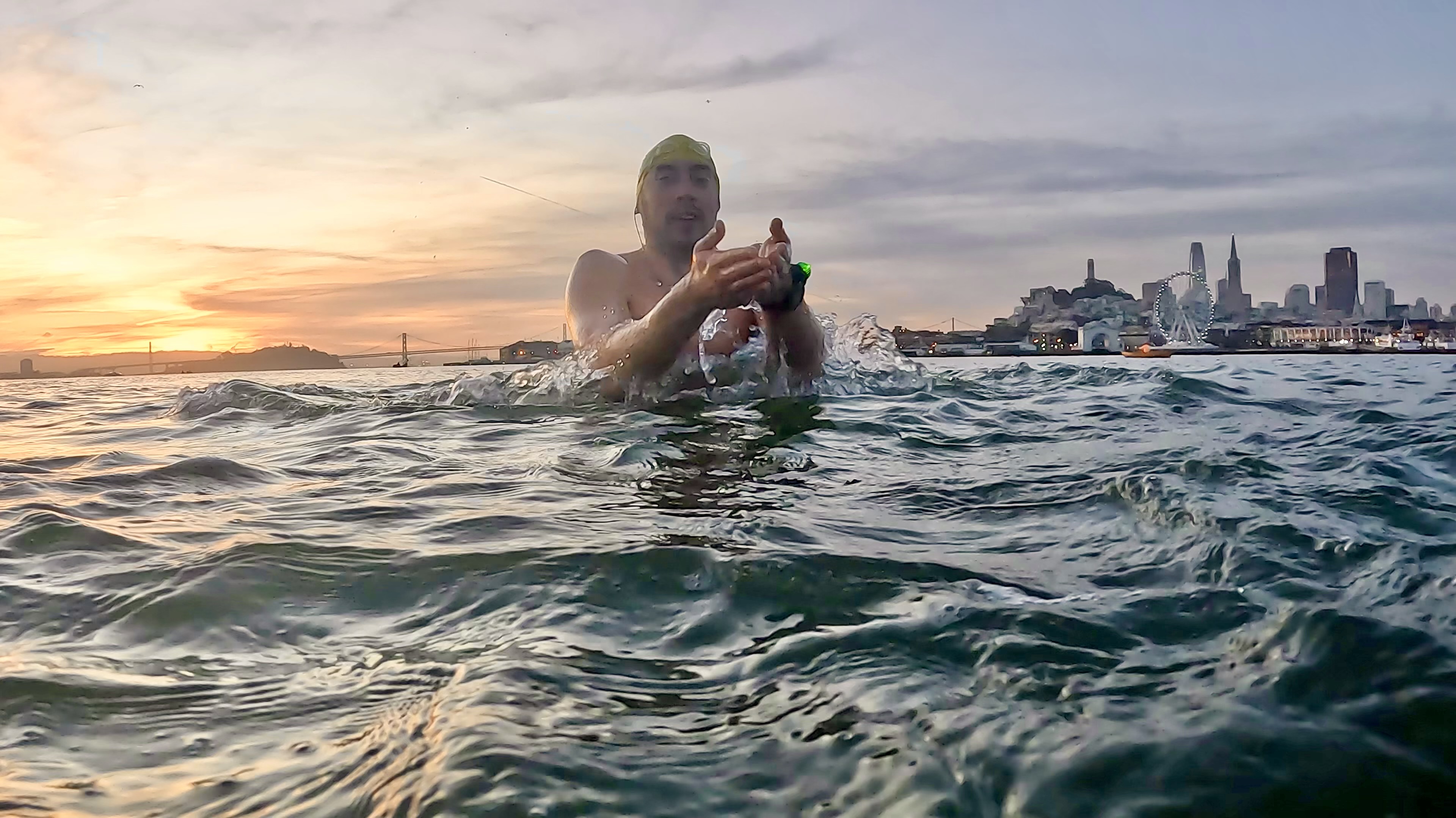 So, like all SERC sheep, I followed everyone else on the march to Pier 39. Four RHIBs arrived shortly after the 15 swimmers. Then, we disrobed. Unlike Zach’s friends, who completely disrobed in the RHIBs for his birthday swim on Wednesday, our disrobing was limited to suitable swim attire.